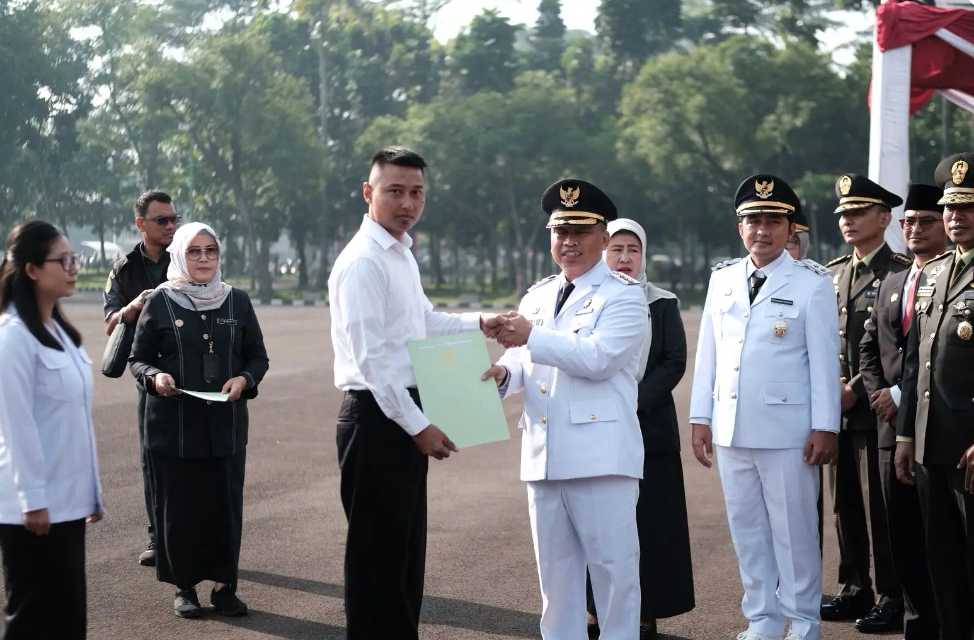 Wali Kota Depok, Supian Suri menyerahkan SK Pengangkatan kepada perwakilan CPNS 2024 Setelah Upacara Peringatan Harlah ke-80 Pancasila di Divif 1 Kostrad Cilodong, Senin (02/06/25).