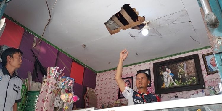 “Jadi apesnya maling, sekarang kejebak tersangkut di plafon, kepala engga kelihatan, sedangkan leher kebawah kelihatan.” kata Faruk selaku pemilik kios aksesoris.