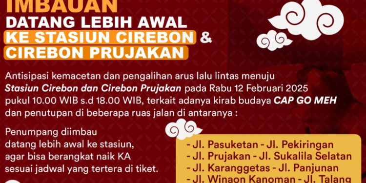 Indograf.com – PT KAI Daerah Operasi 3 Cirebon mengimbau calon penumpang untuk datang lebih awal ke Stasiun Cirebon dan Stasiun Cirebon Prujakan guna mengantisipasi potensi penutupan beberapa ruas jalan serta kepadatan dan pengalihan arus lalu lintas akibat acara Kirab Budaya Cap Go Meh yang akan berlangsung pada 12 Februari 2025 pukul 10.00 hingga 16.00 di Kota Cirebon.
