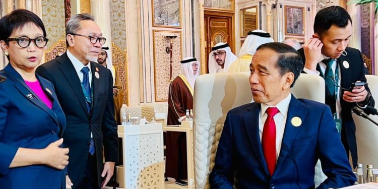 Indograf.com – Presiden Joko Widodo (Jokowi) menghadiri pertemuan Konferensi Tingkat Tinggi (KTT) Luar Biasa Organisasi Kerja Sama Islam (OKI), di King Abdulaziz International Convention Center (KAICC), Riyadh, Arab Saudi, Sabtu 11 November 2023.
