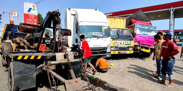 Kejadian berawal, saat truk pengangkut ubi hendak mengisi solar ditabrak dari belakang oleh truk trailer.