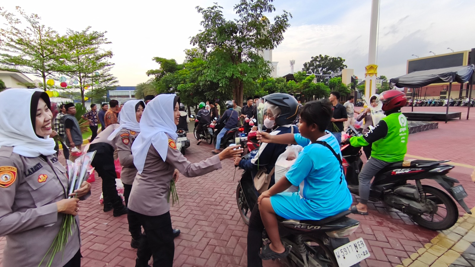 SIDOARJO-Polresta Sidoarjo bersama sejumlah elemen mahasiswa menggelar aksi sosial dengan membagikan takjil dan bunga kepada masyarakat serta pengendara yang melintas di depan Mako Polresta Sidoarjo, Jumat (6/3/2026).