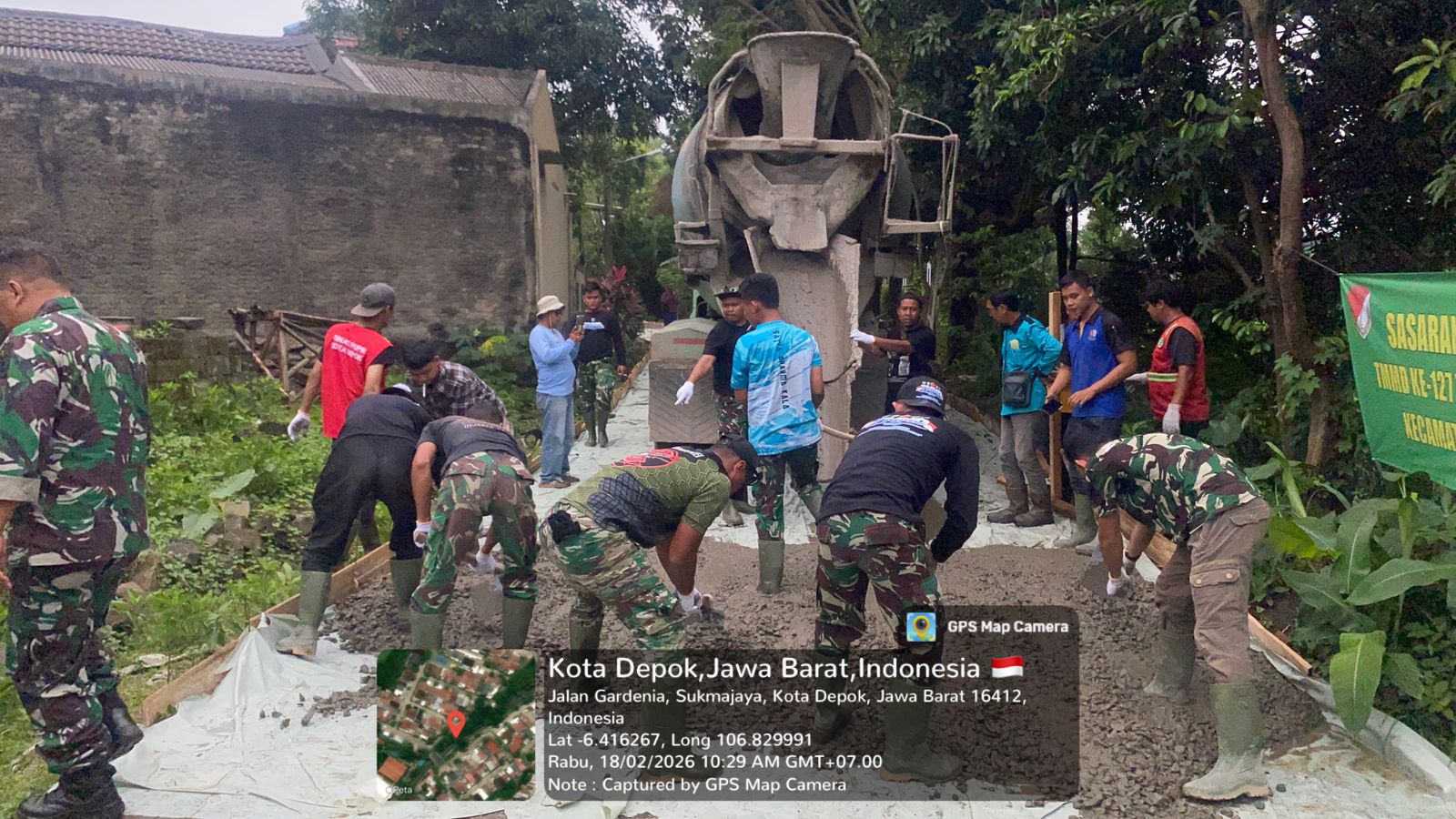 INDOGRAF – Pelaksanaan TNI Manunggal Membangun Desa (TMMD) Ke-127 Tahun Anggaran 2026 oleh Kodim 0508/Depok memasuki hari ke-8, Rabu (18/2/2026), dengan progres signifikan pada sasaran fisik pengerasan jalan di kawasan GDC Sektor Gardenia, Blok Q RT 03/07, Kelurahan Tirtajaya, Kecamatan Sukmajaya, Kota Depok.