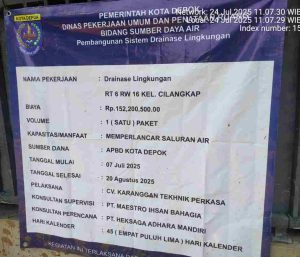 indograf.com, Depok – Proyek pembangunan saluran drainase yang berlokasi di Jalan Banjaran Pucung RT 6/RW 16, Perumahan Mutiara, Cimanggis, Kelurahan Cilangkap, Kecamatan Tapos Depok, menuai sorotan publik. Proyek yang dikerjakan oleh CV. Karanggan Teknik Perkasa dengan nilai kontrak sebesar Rp152.200.500, bersumber dari APBD Kota Depok, diduga dikerjakan tanpa pengawasan ketat dari pihak pelaksana maupun konsultan pengawas.