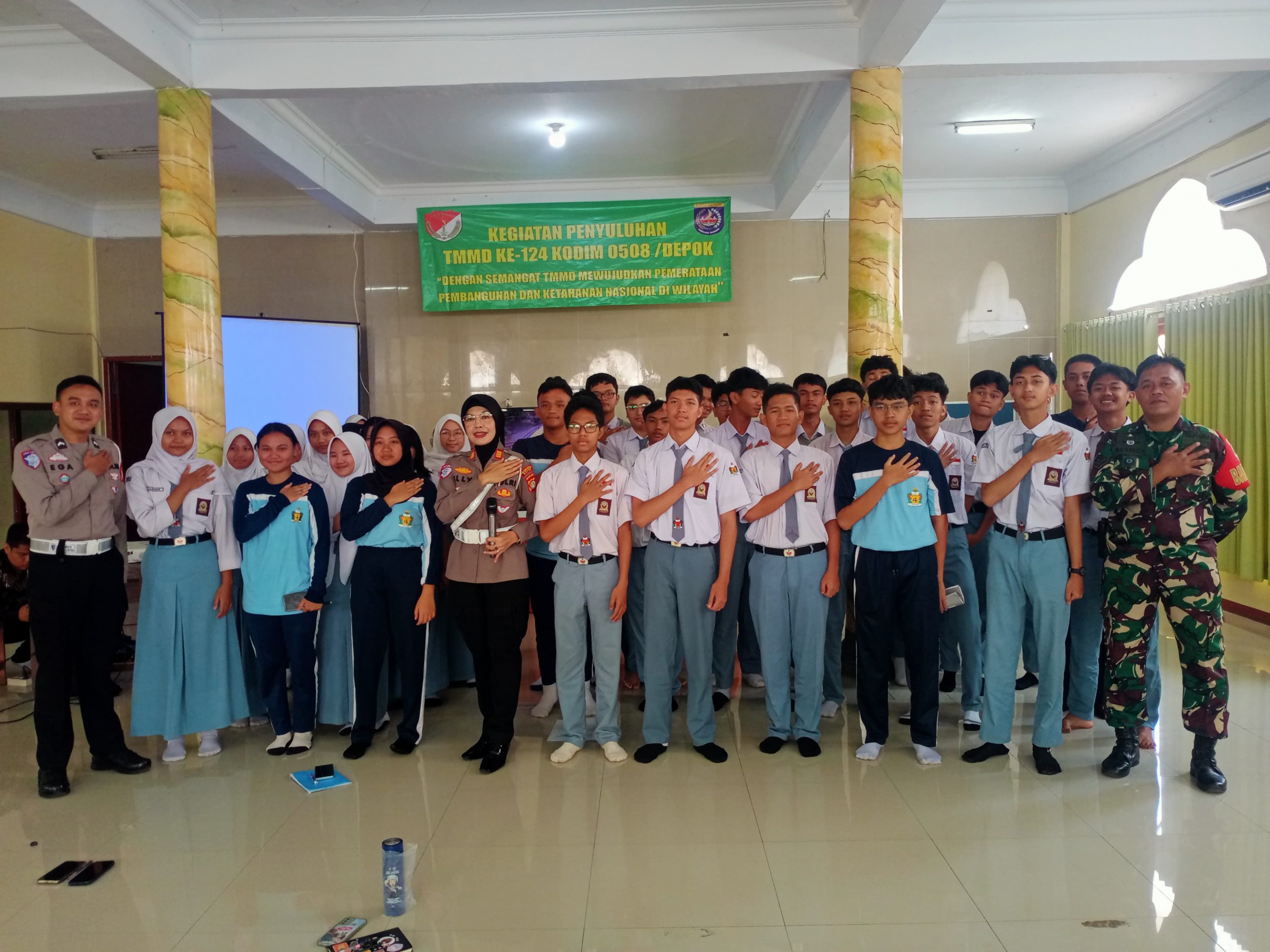 INDOGRAF  – Dalam rangka kegiatan TNI Manunggal Membangun Desa (TMMD) ke-124, Kodim 0508/Depok melalui Koramil 06/Cimanggis menggelar penyuluhan yang bertempat di Aula SMAN 4 Depok, Jalan Jeruk Raya 1, Pondok Sukatani Permai, Kelurahan Sukatani, Kecamatan Tapos, pada Kamis (8/5/2025) pukul 08.00 WIB.
