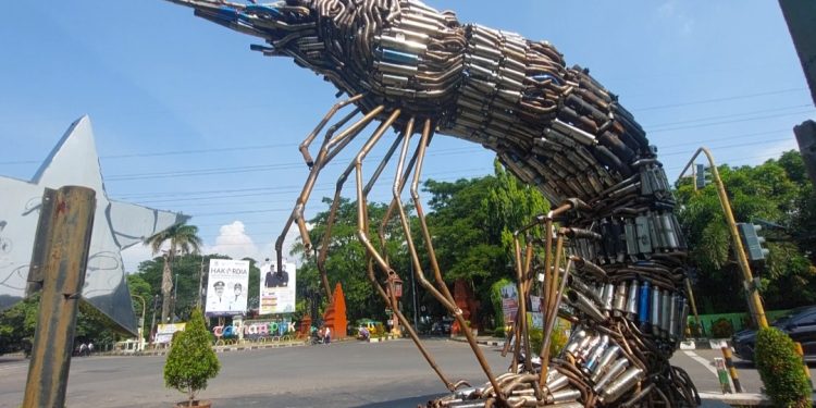 Selain di persimpangan, terdapat juga tugu udang di Mapolresta Cirebon.